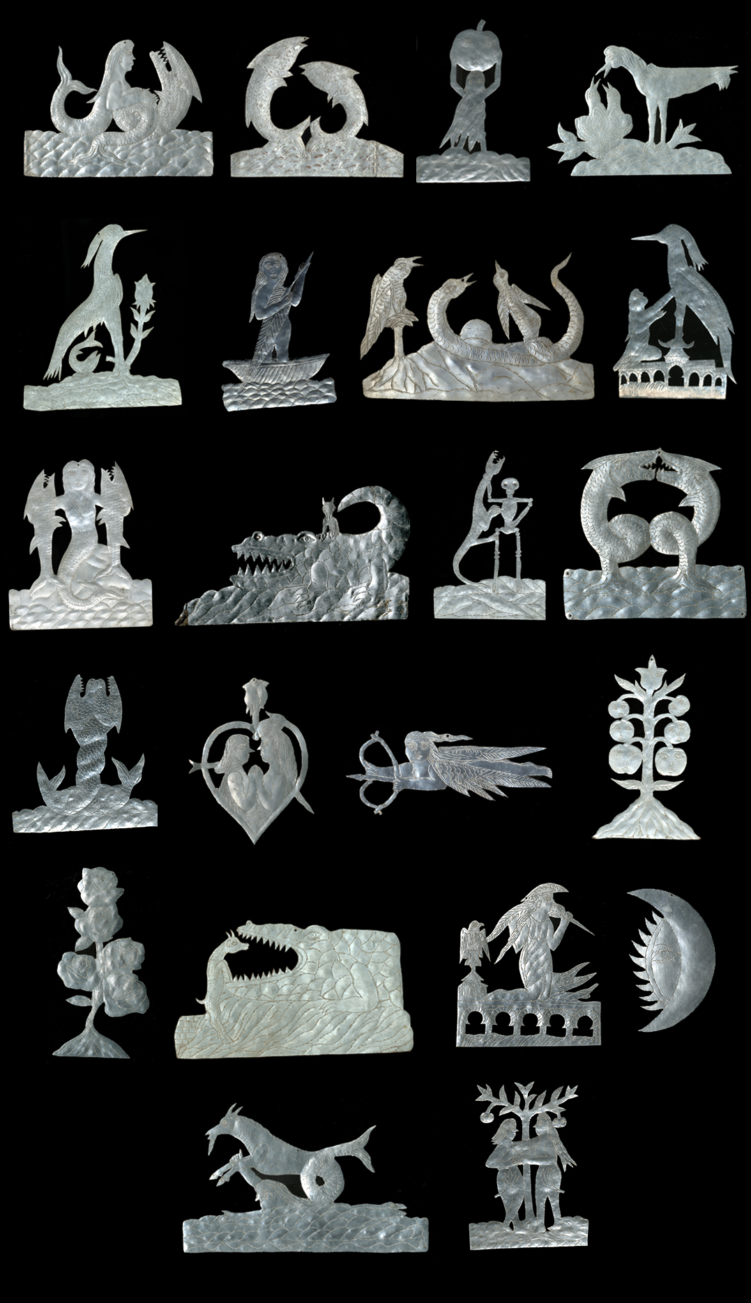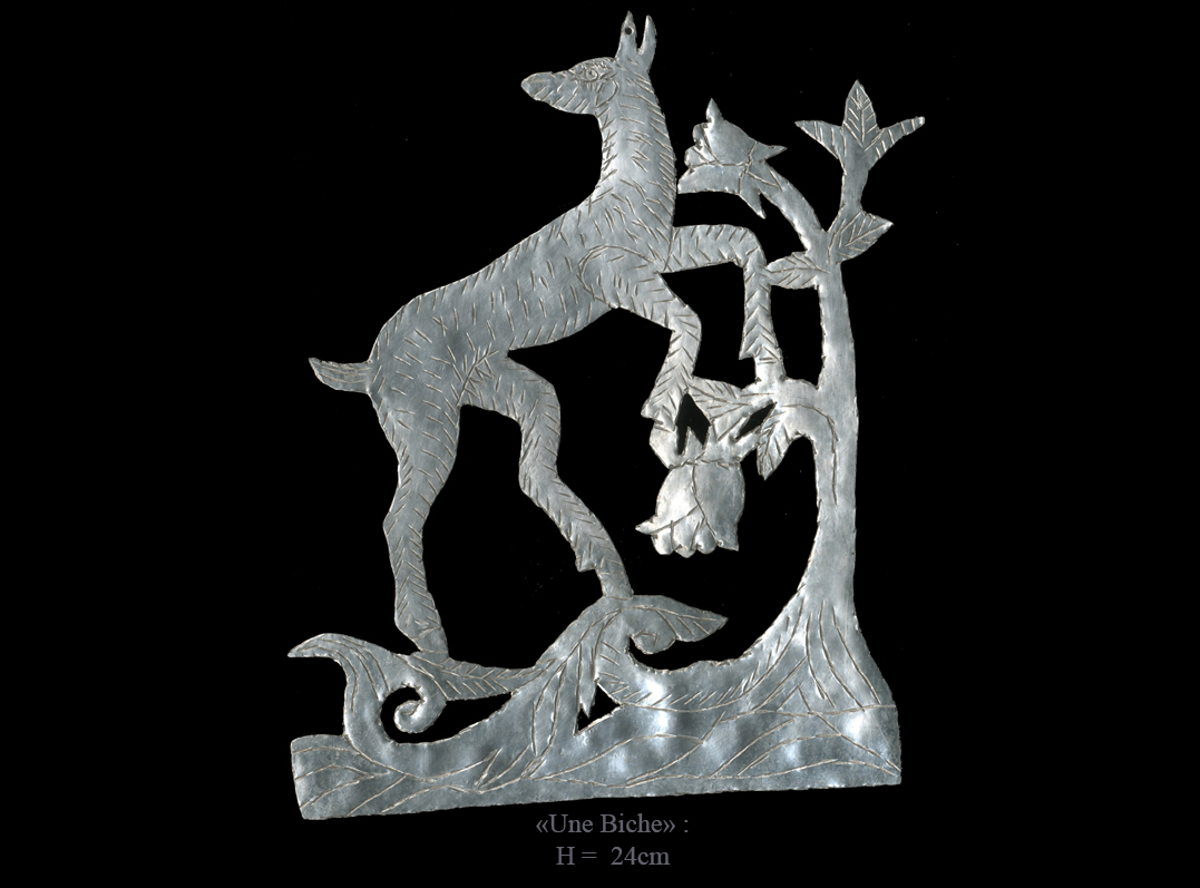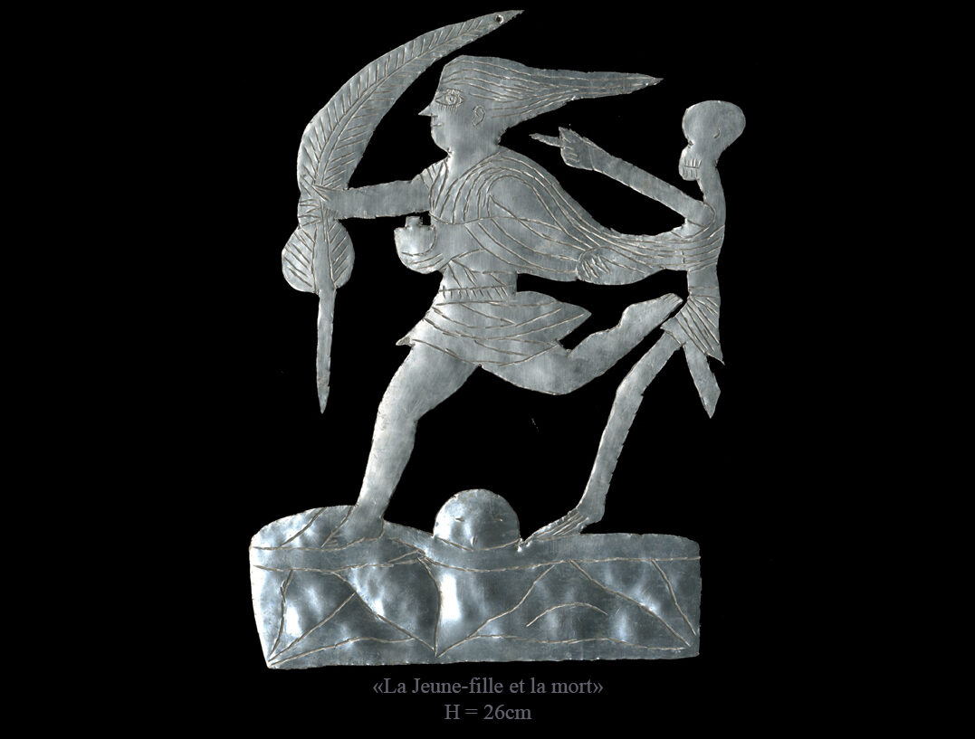 en adaptant quelques-unes de ses figurines en fer blanc en décors en maillechort pour nos armoires en cèdre.