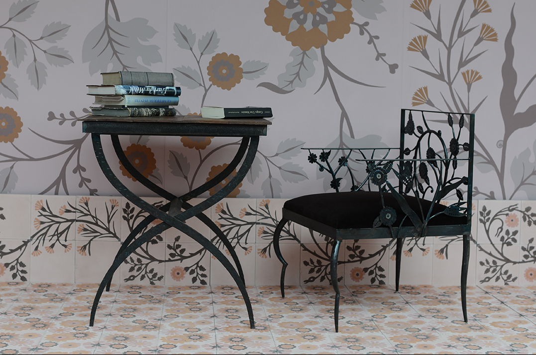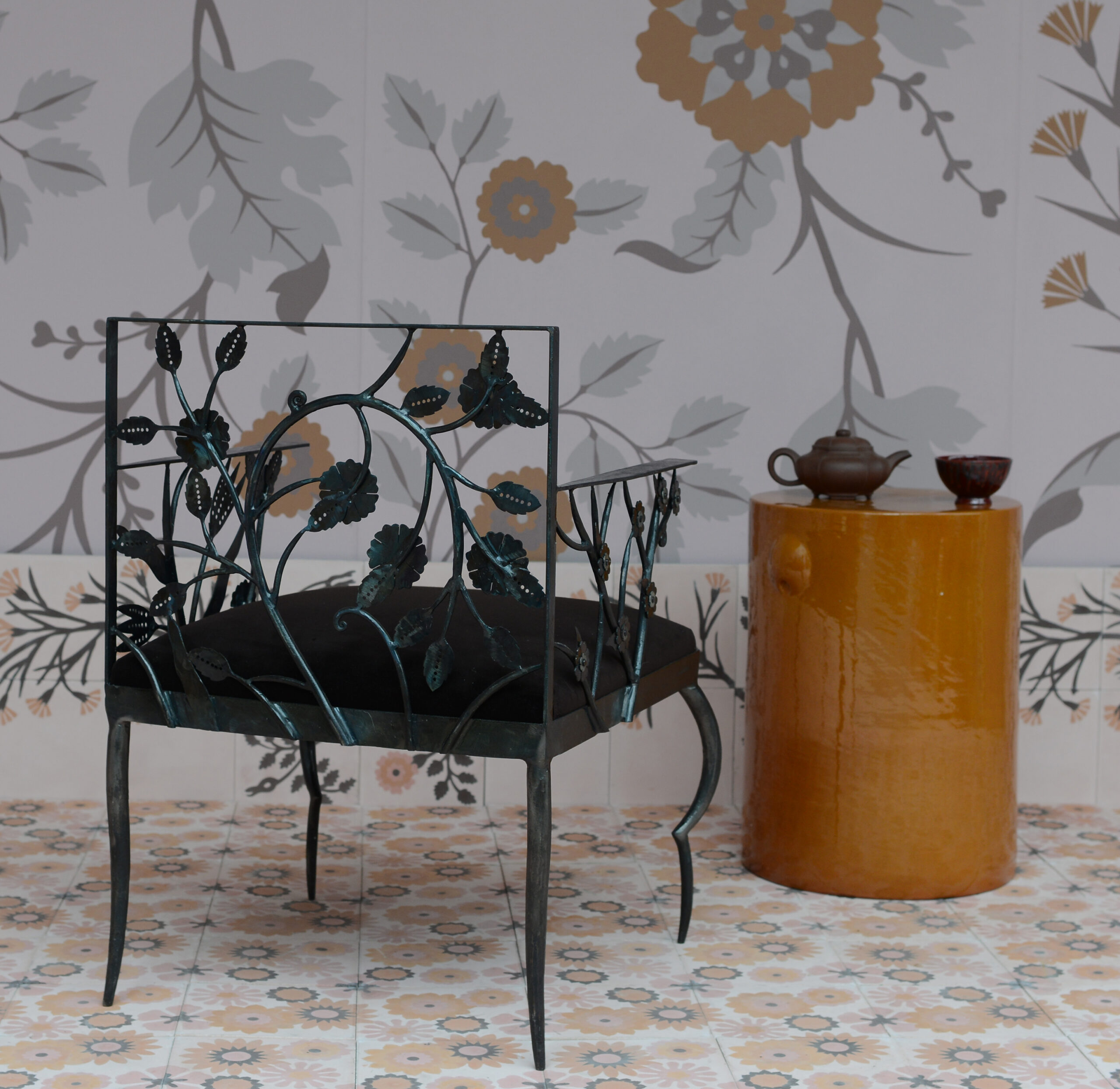 Fauteuil « IZNIK II » en fer forgé : Largeur = 54cm – Profondeur = 56cm Hauteur d’assise = 40cm Hauteur totale = 80cm 1.140,00€ TVAc Garnissage de l’assise en coton blanc compris ou en cuir (prix sur devis).