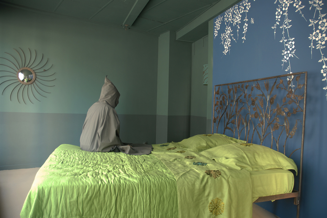 Dismountable wrought iron bed, headboard and L-shaped iron frame with legs to accommodate a bed base.